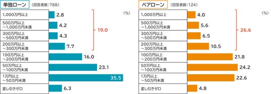 さらに、年間200万円以上資産形成を行っている割合は、単独ローン世帯の19.0%に対し、ペアローン世帯では26.6%と7.6ポイント高く、同じ世帯年収であっても、より高い水準で資産形成に取り組めている世帯が多いことが示されています。