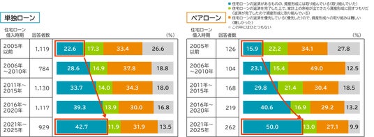 さらに、住宅ローンと並行して資産形成に取り組む世帯(以下、両立派)も、近年増加傾向にあります(図表2)。単独ローン世帯も両立派が増加していますが、特にペアローン世帯では、2021年~2025年における両立派の割合が50.0%に達しており、住宅ローン返済と資産形成を同時に進める家計運営が、一定の広がりを見せています。