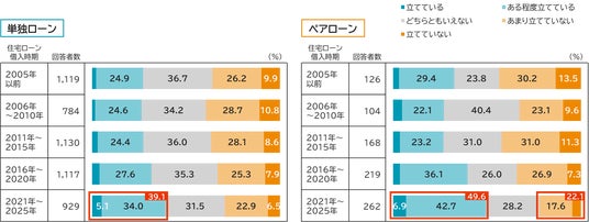なかでもペアローン世帯においては、その傾向がより顕著です。2016年以降、ライフプランを策定している割合は大きく上昇しており、2021年~2025年では「立てている・ある程度立てている」が49.6%と、およそ半数に達しています。この割合は、同時期の単独ローン世帯よりも10ポイントほど多い結果となっています。