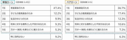 では、それぞれの世帯は何のために資産形成を行っているのでしょうか。最大の目的について確認したところ、単独ローン世帯、ペアローン世帯ともに「老後資金のため」が他の項目を大きく上回っています(図表4)。また、2位以下の項目についても、その並びはいずれの借入形態においても同じ結果となりました。一方で、「特に目的はない」とする割合は、単独ローン世帯9.2%、ペアローン世帯6.3%と少数派であり、両立する以上、やはり何らかの目的を考えて行っている世帯が多いことが見て取れます。