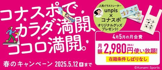 コナミスポーツ株式会社が運営するコナミスポーツクラブでは、2025年3月28日(金)から2025年5月12日(月)まで、フィットネスクラブ春のキャンペーンを実施します。期間中は入会時の登録料が0円となり、特別価格で施設を利用できるほか、人気イラストレーターunpisさんのオリジナルグッズをプレゼントします。