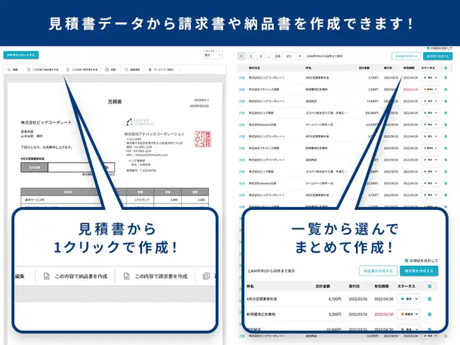 ・見積書データを選択して請求書や納品書に引用作成できるので入力ミス防止につながります。