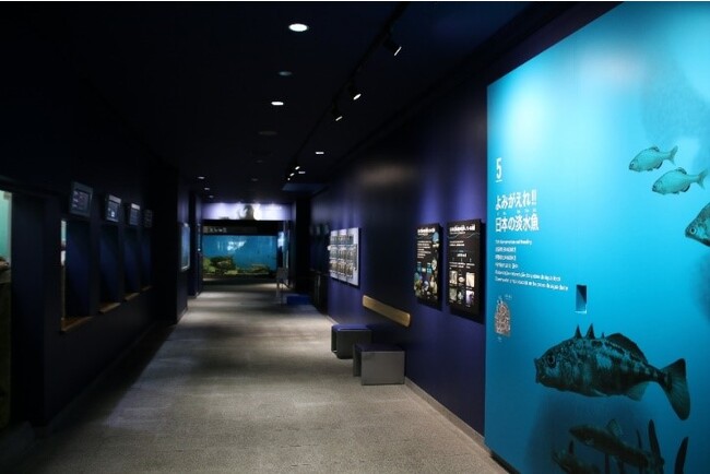 「よみがえれ!日本の淡水魚」コーナーは、絶滅のおそれのある日本の淡水魚を系統保存する「保護増殖センター」で繁殖させた魚を展示しています。多くの淡水魚が絶滅の危機に瀕しているという現状をより多くの人に知ってもらうことを目的としています。