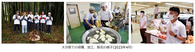 活動を開始した2022年には、大分県中津市の放置竹林による竹害が深刻化しているという問題を受け、立命館アジア太平洋大学の12人の学生にご参加いただき、未収穫農作物であるタケノコを収穫・加工(水煮)し、県内のスーパーで販売しました。2年目となる今年は、立命館アジア太平洋大学、九州大学、別府大学、大分大学の4大学の学生20人とともに活動に取り組んでおり、この度株式会社三越伊勢丹の協力を得てコラボイベントを開催し、地元大分県だけではなく、東京の伊勢丹新宿店でもこのタケノコの水煮を販売することとなりました。