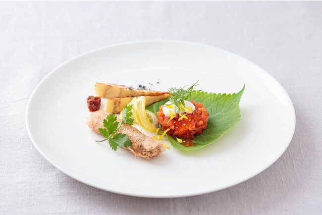 広島県廿日市市のモダンベトナム料理のお店「CHILAN」のドグエン チランシェフが手がけるコース料理の中の前菜の一つとしてタケノコの水煮を活用。