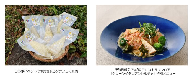 イベントでは、伊勢丹新宿店本館地下1階のフレッシュマーケット/青果でのタケノコの水煮の特別販売と試食提供、また同フロアのキッチンステージにて同じくタケノコの水煮を使った特別メニューを展開する他、本館7階のレストランフロアでは、本取り組みにご賛同いただいたレストラン(全3店舗)でもタケノコの特別メニューが提供されます。「MIRAINOMOTO(R)」プロジェクトに参加した学生が収穫・加工した旬のタケノコを、ご家庭や伊勢丹新宿店のレストランで召し上っていただくことで、食を楽しみながら、地域の課題やフードロスについても知っていただけるイベントです。