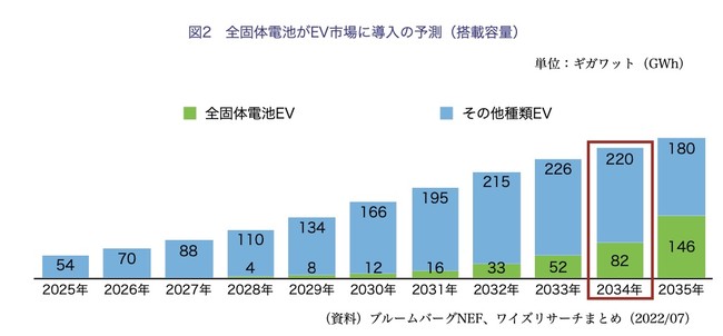 調査会社の米ブルームバーグNEF(BNEF)の予測によると、全固体電池は28年からEVに搭載され始め、全固体電池モジュールの生産コストがリチウムイオン電池に近付く33年以降にEVへの搭載が急増する見通しだ。