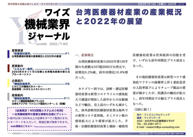 ワイズコンサルティング グループ(本社:中華民国台北市、代表取締役:吉本康志)は台湾機械業界専門誌「ワイズ機械業界ジャーナル」の2022年7月第2週号を発行しました。今週号では、医療器材業界、エネルギー業界、CNC工作機械大手メーカーの亜崴機電(AWEAメカトロニック)、機械設備業界の動向をご紹介します。