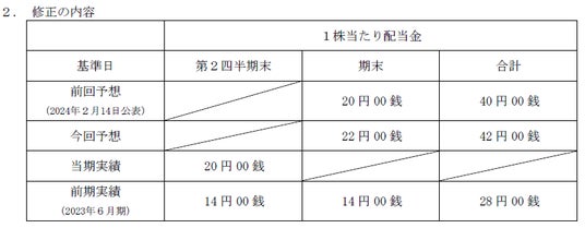 当社は、財政状況や業績等を勘案しつつ、安定配当を継続することを株主の皆様への利益還元の基本方針としております。2024 年6月期の期末配当予想につきましては、業績の動向や配当性向等を総合的に勘案し、従来予想より1株当たり2円増配し、年間配当金は40 円から42 円に修正することといたしました。