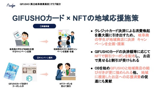 「GIFUSHO」カードは、利用額に応じて「GIFUSHO」カード会員でないと手に入らない県岐商の部活動記録動画などの限定特典がもらえるほか、同校の教員と生徒が共同でデザインしたオリジナルデザインのクレジットカードを発行することが可能です。日常の買い物で GIFUSHO を応援できる仕組みになっており、利用額の一部がGIFUSHOの活動支援に充てられます。今後は生徒が企画立案を行い、岐阜市周辺地域の店舗での「GIFUSHO カード決済キャンペーン」の実施や、ナッジカードのアプリに内蔵された NFT ウォレットを活用し「卒業生や保護者のお店で QR コードを読み込むと限定 NFT やクーポンを取得できる仕掛け」などを検討し、地域活性化を図ってまいります。また、「GIFUSHO」カードが使われたデータ(利用店舗、金額、年齢層、日時など)についても、生徒の研究対象とすることで、金融教育として活用するとともに GIFUSHO の新たな施策に生かしてまいります。