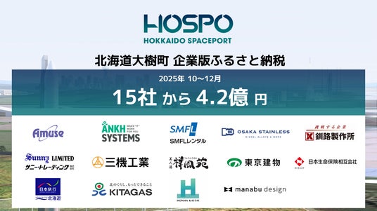 北海道大樹町(町長:黒川豊)は、民間にひらかれた商業宇宙港「北海道スペースポート(HOSPO)」プロジェクトの資金として、2025年10月から12月までの間に、北海道内外の15社から4.2億円の企業版ふるさと納税による寄附をいただきましたいた。