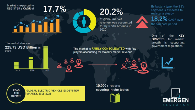 電気自動車の採用を促進する政府の有利な政策と規制、およびバッテリーコストの着実な削減は、電気自動車エコシステム市場の収益成長を促進するいくつかの重要な要因です。