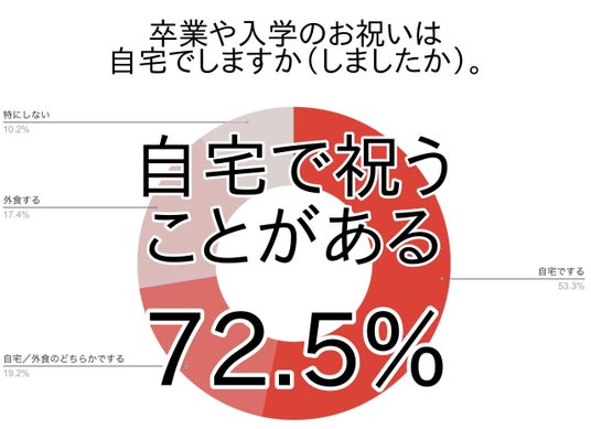 今回のアンケートでは、卒業や入学のお祝いを自宅ですることがある方は約7割(関東72.5%・全国65.8%)でした。