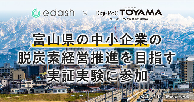 CO2排出量可視化のクラウドサービス「e-dash」を提供するe-dash株式会社(本社:東京都千代田区、代表取締役社長:山崎冬馬、読み:イーダッシュ、以下「当社」)は、富山県(知事:新田八朗)が主催する実証事業「Digi-PoC TOYAMA」(読み:デジポックとやま)の実証実験プロジェクトに参加することをお知らせします。