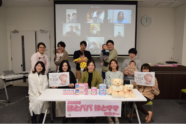 この研修は、ユニ・チャームと江崎グリコがコラボする企業向け両親学級「みんなの育休研修」を、当社が定期的に開催する「はとパパはとママセミナー」で実施するもので、産休取得予定者、育休取得予定者などを対象に、男性育児が子どもや家族に与える影響や、乳児期の育児で大きな負担となる“授乳”“排泄”の方法などについて、江崎グリコの栄養士・子育てアドバイザーなどの話を交えながらご紹介していただきました。