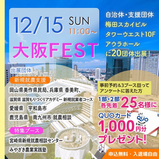宮崎県は、宮崎県外からの新規就農希望者の受入促進を目的として、(株)マイナビとコラボし、12月15日(日)午前11時から、就農相談会(大阪)へ参加します。
