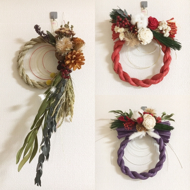 クリスマスにもお正月にも使えるカラフルなしめ縄を、ドライフラワーを使って作ります。