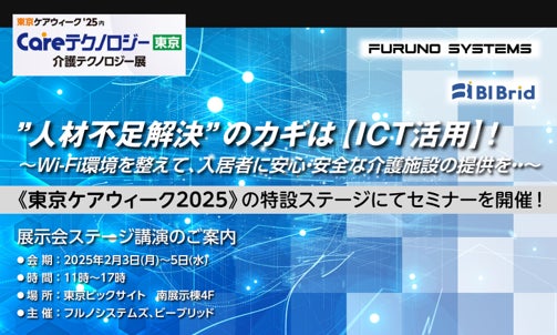 業務用無線機器メーカーの株式会社フルノシステムズ(本社:東京都墨田区、代表取締役社長:中谷聡志、古野電気(株)関連会社)は、介護用品や設備・ソリューションなどを展示する介護分野の総合展示会 「第11回 CareTEX(ケアテックス)東京‘25」に出展いたします。ケアテックス東京は、東京ビッグサイト(東京都江東区)で2025年2月3日(月)から5日(水)の3日間開催されます。