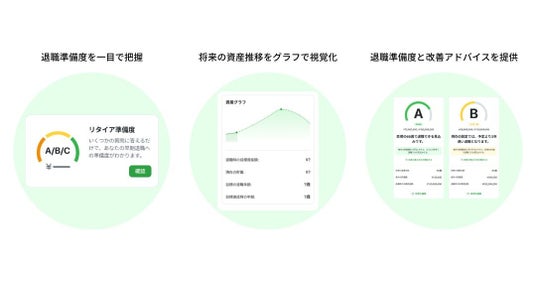 年齢、居住地、収入、貯蓄状況などの基本情報に加え、アプリに連携された家計データを組み合わせ、現在の退職準備度を推定し、改善に役立つヒントを表示します。