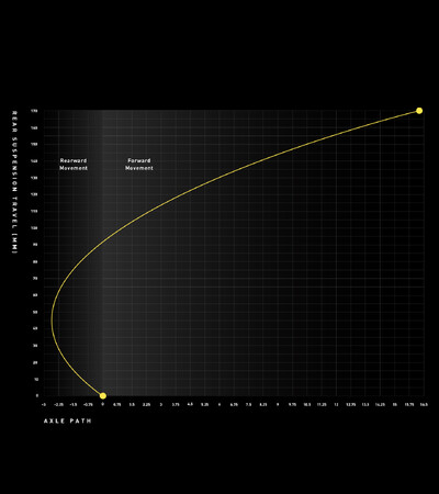 ショックのコンプレッション側に作用するテンションリンクを追加したことで、レバレッジレシオとアクスル軌道を別々に独立して調整できるようになり、スプリングとダンパーの性能を大幅に改善しました。さらに、わずかに後方へ向かうアクスル軌道は、障害物と衝突した際、引っかかるのではなくホイールを後方へ逃がすことで、衝撃を巧みに吸収します。また、初期トラベルでアンチスクワット特性を発揮し、ペダリング効率を向上させます。