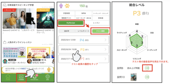 過去のテスト結果の一覧や、テスト時の録音音声を再生することも可能です。