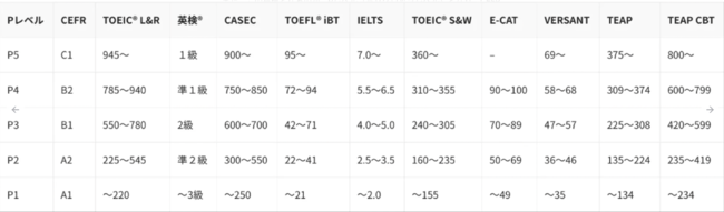 マイレシピでは最初にレベルチェックテストを行い、その結果とあなたがすでに持っている各種英語検定の成績を加味しながらPレベル(ポリグロッツレベル)を決定します。レベルは5段階となっており、各種英語検定との対応は以下のようになっています。