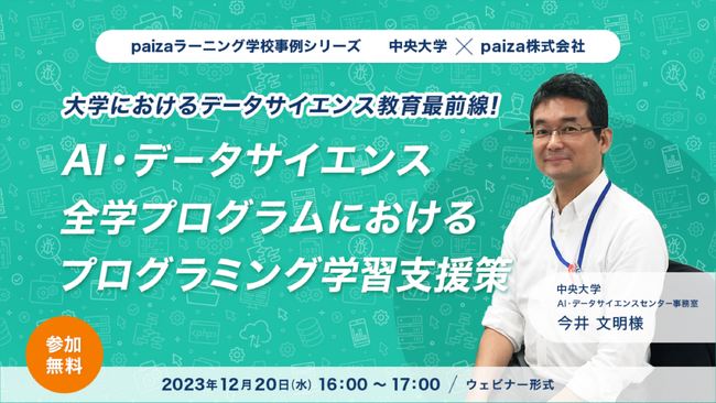 ITエンジニア向け国内最大の転職・就職・学習プラットフォーム「paiza(パイザ)」を運営するpaiza株式会社(東京都港区、代表取締役社長/CEO 片山良平)は、12月20日(水)に大学・専門学校の教員向け無料ウェビナーの第3弾となる「大学におけるデータサイエンス教育最前線! ~中央大学様事例~」(paizaラーニング学校事例シリーズ)を開催いたします。
