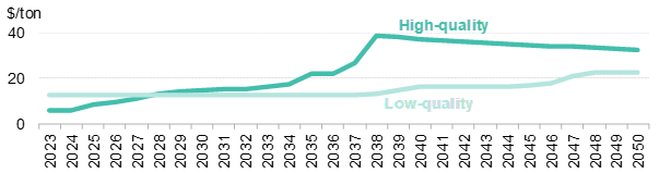 この分岐シナリオでもう一つの市場は、残りの低品質のオフセットを取引するものとなります。具体的には、発電およびアジアと中南米における自然ベースのソリューションを用いたオフセットを含みます。2025年では、需要増により1トンあたりの価格が12ドルと高品質クレジット市場よりも高価ですが、50年予想では22ドルにとどまります。このような低品質の市場を利用する企業は、オフセットを活用してネットゼロ目標を達成する可能性がありますが、現在よりもはるかに大きな風評リスクに対処する必要に迫られるでしょう。