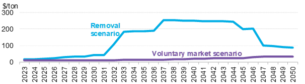 図1:ボランタリー市場および除去シナリオ下でのカーボンオフセット価格