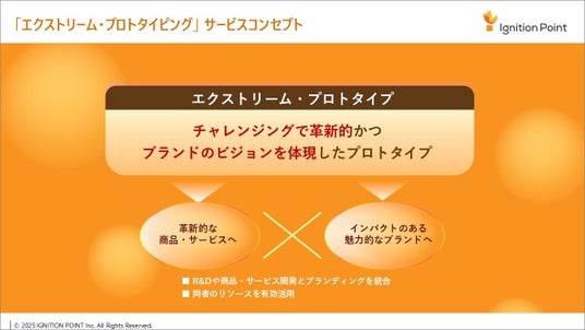 新事業創出やDXを強みに、クライアントのイノベーションや変革を支援するイグニション・ポイント株式会社(本社:東京都渋谷区、代表取締役社長:末宗喬文、以下 イグニション・ポイント)は、革新的な商品やサービスの開発とブランディングを統合的に伴走支援する新サービス「エクストリーム・プロトタイピング」の提供を開始します。本サービスは、ブランドのビジョンを体現する革新的なプロトタイプ開発を核として、リソースを有効活用しながら市場に強いインパクトを与える魅力的なブランドの創出を支援します。