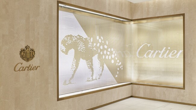 石が生み出すダイナミックでモダンなファサードのコーナーにあるインタラクティブウィンドウは、人の動きに合わせてイメージが変わるほか、ある時はカルティエの象徴「パンテール」が通り抜け、道行く人の目を奪います。