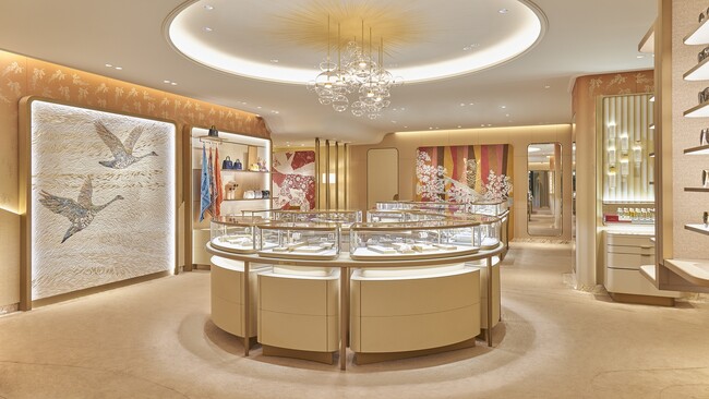 明るく開放的なエントランスから見える印象的な2つのアートウォールには、カルティエが創業以来培ってきた「サヴォアフェール」に想いを重ね、日本の伝統工芸が取り入れられています。一つは、永遠の愛の象徴と言われるつがいの白鳥が空を舞うモザイク画。モザイク壁画の第一人者である上 哲夫(うえ てつお)が手掛けたこの作品は、伝統的なモザイク画に現代の要素をとりいれ、「石」本来の美しさを最大限に引き出しています。もう一つは、木の温かみを感じる作品。光沢のある天然トチ材を使用し、木目を互い違いに張り込み染色した木製パネルには、カルティエの象徴 「パンテール」と生命を象徴する桜が描かれています。