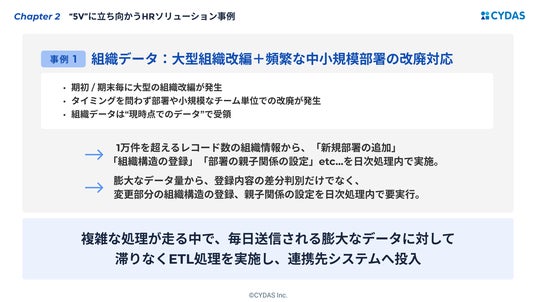 大手企業では、期初・期末の大規模な組織改編に加え、日常的に部署やチーム単位での小規模な改廃が頻繁に発生します。こうした状況下では、組織データが1万件以上にも及び、人事・総務部門がすべてをリアルタイムで把握・管理することは困難です。その結果、現場からは「直近の組織図をもとに差分データを自動で抽出・反映してほしい」「深夜に届いたデータでも、翌朝の経営会議に間に合うように更新しておいてほしい」といった高度かつ時間制約のあるニーズが寄せられていました。