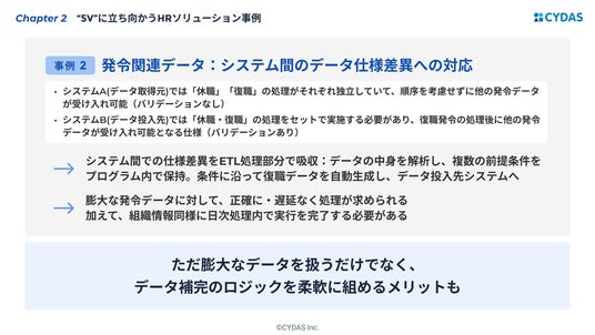 続いて、サイダスがDALと連携し進めた2つのプロジェクトを事例として紹介。DALの「ACMS Apex」を活用することで、膨大かつ複雑な人材データを扱う基幹システムと「COMPANY Talent Management」シリーズをWeb APIで連携し、人材データの統合・変換プロセスを最適化した好事例を紹介しました。