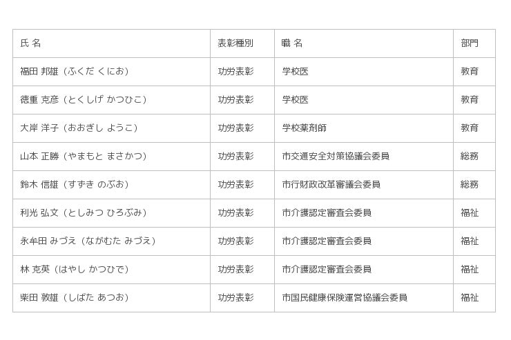 今年度は、交通安全や福祉などさまざまな分野で市政発展に多大なご貢献をいただいた9名の皆様が表彰され、表彰状と記念品が授与されました。