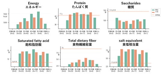 またライフログの分析結果より、飽和脂肪酸や食塩相当量は過剰摂取である一方、野菜・果物の摂取量が少ない傾向があり、生活習慣病リスクの高い食生活の方が多いことも明らかになりました。
