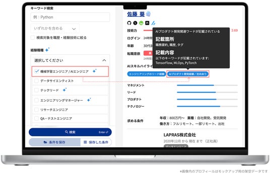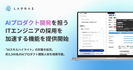 LAPRAS株式会社(所在地:東京都渋谷区、代表取締役:染谷健太郎、以下、LAPRAS)は、エンジニア採用サービス「LAPRAS」において、候補者の潜在的なスキル・経験をAIが自動判別して可視化する「AIスキルハイライト」機能に、新たに「AIプロダクト開発経験/志向あり」ラベルを追加しました。これにより、職歴上では見えづらかった潜在的な経験者や志向を持つ候補者も含め、AIプロダクト開発を担えるエンジニアを見過ごすことなく発見できるようになります。