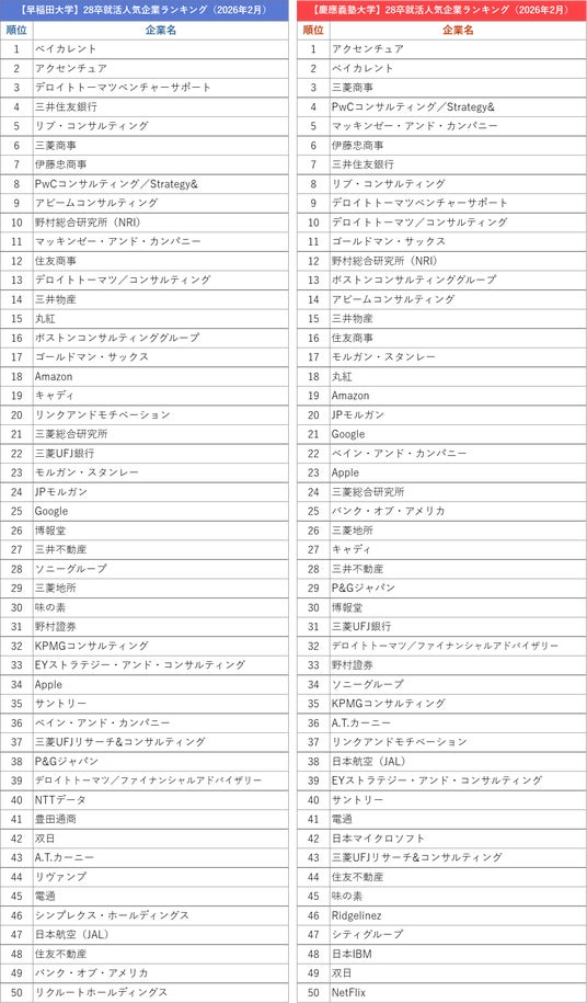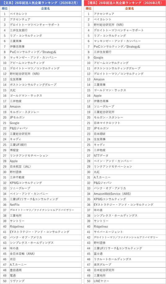 「世界で挑戦できる人材を育み、未来を創る」を掲げ、ユーザーファーストを追求したキャリアプラットフォーム「外資就活ドットコム」を運営する株式会社ハウテレビジョン(本社:東京都港区、代表取締役:音成洋介)の外資就活総合研究所は、「2028年卒 就活人気企業ランキング(2026年2月)」を発表します。本ランキングは調査時点における状況を示すもので、採用活動の時期によって学生の関心が移り変わるため、複数回に分けて調査を行っています。今回は2028年卒ランキングの初回調査として、2026年2月1日時点の企業フォロー数(累計)を集計しました。この時期は、学部生では主に大学2年生が対象となり、情報収集や応募準備が始まりつつある段階です。そのため、知名度の高い企業や早期から情報発信を行ってきた企業にフォローが集まりやすい傾向が見られました。