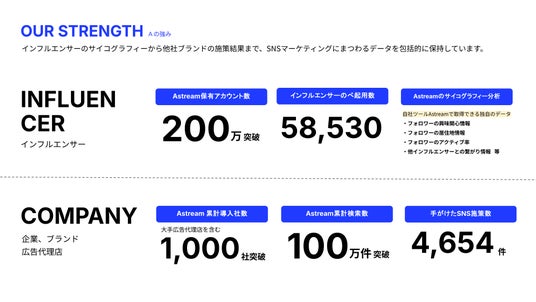 当社は2017年の設立以来、インフルエンサーマーケティングのプロフェッショナルとして多岐にわたる事業を展開してまいりました。代理店としてのインフルエンサーマーケティング支援や、AIを活用したインフルエンサーマーケティングツール「Astream」の開発・提供など、先端的テクノロジーと人間の経験やクリエイティブ力を掛け合わせた、最適なソリューション提供に強みがあります。