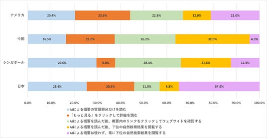 また、利用方法に関する質問では、「AIによる概要を読んだ後、概要内のリンクをクリックしてウェブサイトを確認する」と回答した割合が、アメリカとシンガポールで最も多く、中国では2番目に多い結果となりました。