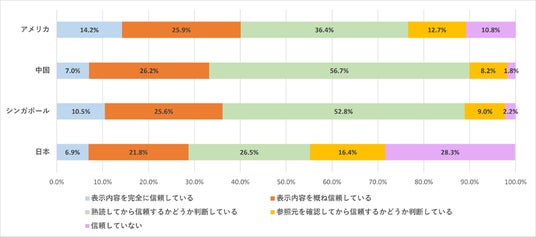 利用している生成AIツールについて質問を行った結果、2025年3月の調査時点で、最も使われている生成AIは「ChatGPT」であり、特にシンガポールでは圧倒的なシェアを獲得しています。アメリカにおいても、シンガポールと似た傾向ではあるものの、AIの普及率としてはシンガポールには至っていないことが明らかになりました。中国では「Deep Seek」の利用者がGoogle Geminiに次いで3番目に多い結果となり、中国国内における高いシェア率が明らかになりました。一方、日本においては生成AIの利用率が調査対象4カ国の中で最も低く、AIが生成した回答への信頼度も最も低いという結果になりました。