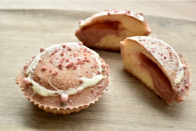 カスタードをベースとする桜クリームをブリオッシュ生地で包み、桜ペースト(桜の花と葉の塩漬けを丁寧に塩抜きしたペースト)を加えたクッキー生地をかけて焼き上げました。桜のパールチョコや桜のクランチが食感のアクセントになった、春のウキウキ感を表現したパンです。