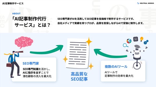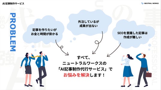 記事制作にはさまざまな目的がありますが、最も重要なことは成果につながるかどうかだと考えています。どんなに素晴らしい記事を制作したとしても、それを見てもらえる機会がなければ意味の薄いものになってしまいます。ニュートラルワークスのAI記事制作代行サービスは、サイト流入増や成果に寄与するSEOを意識した記事を低コストで制作いたします。