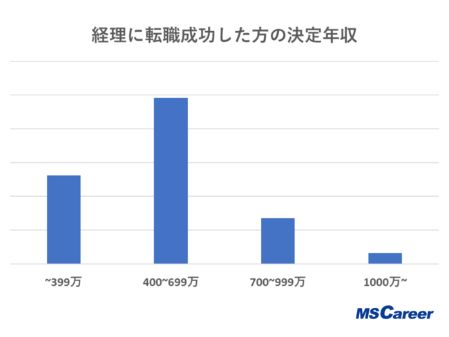 経理・財務への転職では、決定年収は平均が524.8万円、中央値が473.6万円で、一番人数の多かった層は「400~699万円」となりました。