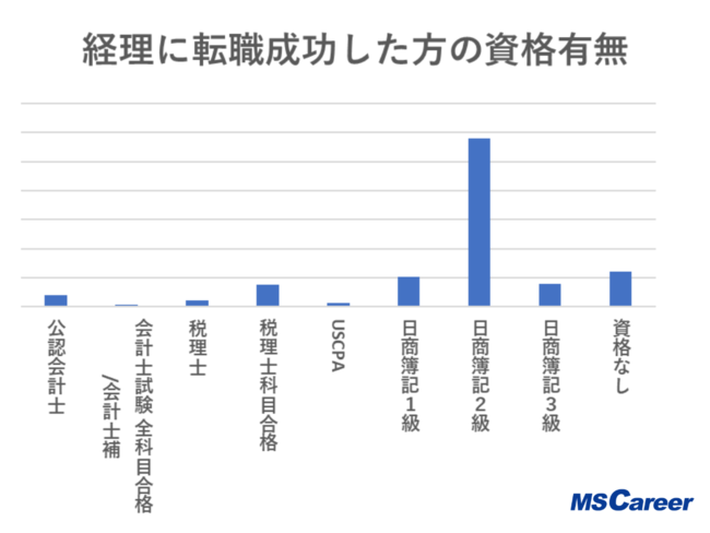 また資格保持状況に関する調査では、全体の簿記や税理士、公認会計士等の資格を保有せず転職成功した方は全体の13.2%にとどまり、最も多かったのは「日商簿記2級」保持者で全体の63%にのぼりました。