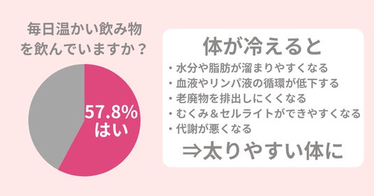 株式会社アースケアは20~30歳の女性100名に「飲み物」に関する調査を行いました。<調査結果>57.8%の女性が毎日温かい飲み物を飲んでいる