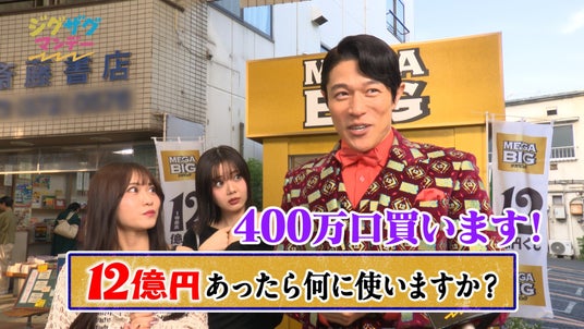 冒頭、億山が商店街を歩いているとTV番組の街頭インタビューを受けている女性たちを発見。女性たちの後ろを通っていると、「12億円あったら何に使いますか?」という質問が耳に入り、女性たちの会話が気になってしまいます。後ろから何度も覗き込んでいるうちに、我慢ができずインタビューに乱入してしまいます。インタビュアーが億山に思わず質問すると、「MEGA BIGを400万口買います!」と答え、最後はマイクを手にMEGA BIGを視聴者にアピールします。12億円の使い道を熱く語りながら、女性たちと盛り上がる億山のコミカルな動きに注目です。