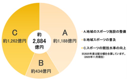スポーツくじの収益による助成は、2002年から実施しており、これまでに約2,884億円の助成を行っています(2025年度は配分額を合算)。