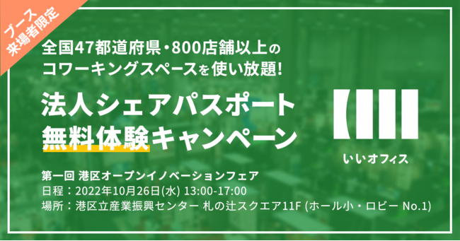 開催期間中に当社ブースにお越しいただいた方に、全国800店舗以上のコワーキングスペースを利用できる「法人シェアパスポート」(月額3万円)を10月31日まで無料でご利用いただける特典を先着ご提供いたします。