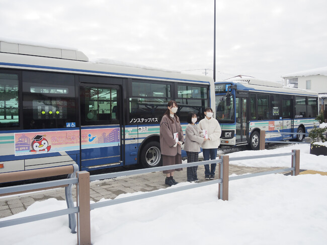 県立広島大学(学長 森永 力,広島県庄原市)生命環境学部及び総合学術研究科の学生が備北交通株式会社( 代表取締役 山根 英徳 ,広島県庄原市)の路線バスの広告をデザインしました。2022年12月27日(火),備後庄原駅において,学生がデザインしたバスの発車記念式典が開催されました。